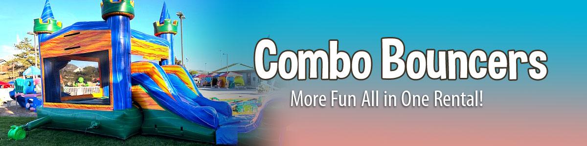 Get the best of both worlds with our awesome bounce & slide combo rentals. These popular inflatable rentals give you more fun with a large bounce area and an attached inflatable slide. Check out the various options as each has its own identity when comes to the included options. All our inflatables are manufactured with "lead-Free" vinyl for your children's and guest's safety.